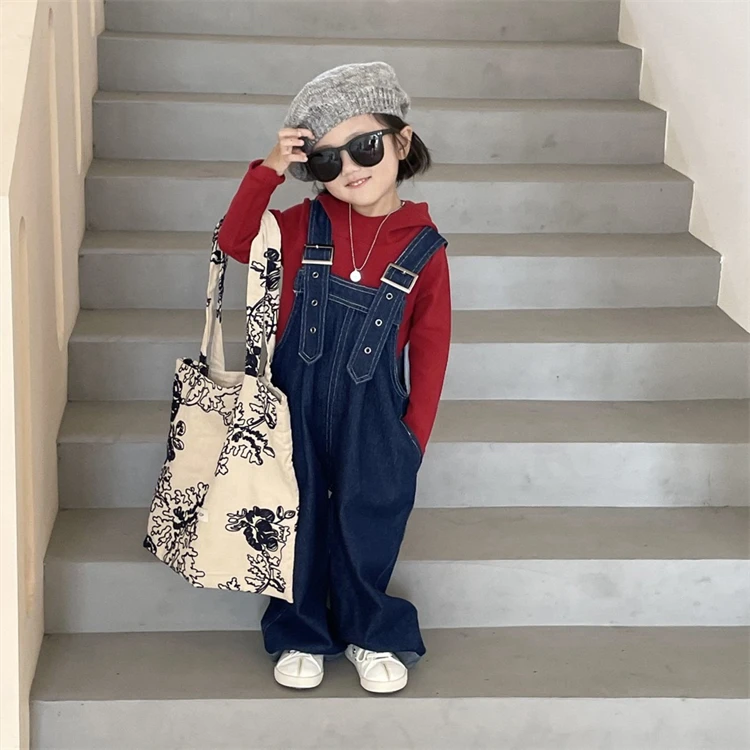 Boys Girls Denim Jumpsuit Blue Loose Wide Leg Suspender Jeans Spring Autumn Casual Overalls Children Casual Romper Pants
